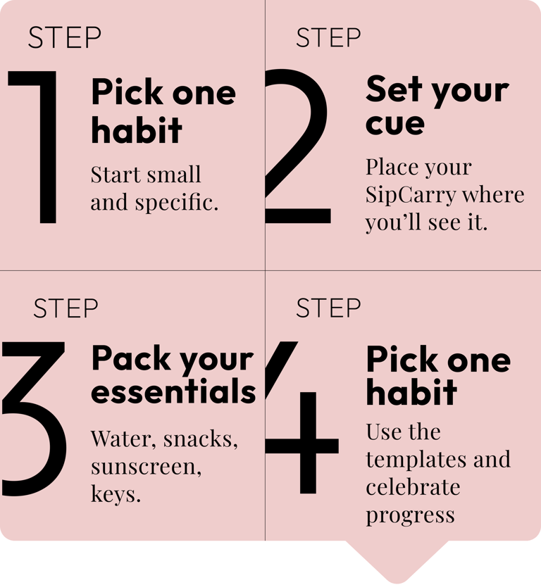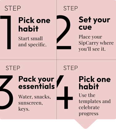 Habits don’t grow from discipline alone — they grow from structure, reminders, and identity. That’s why we created the SipCarry Method: four simple steps that show you how to use your bag as more than an accessory. It becomes your daily system for clarity, action, and progress.